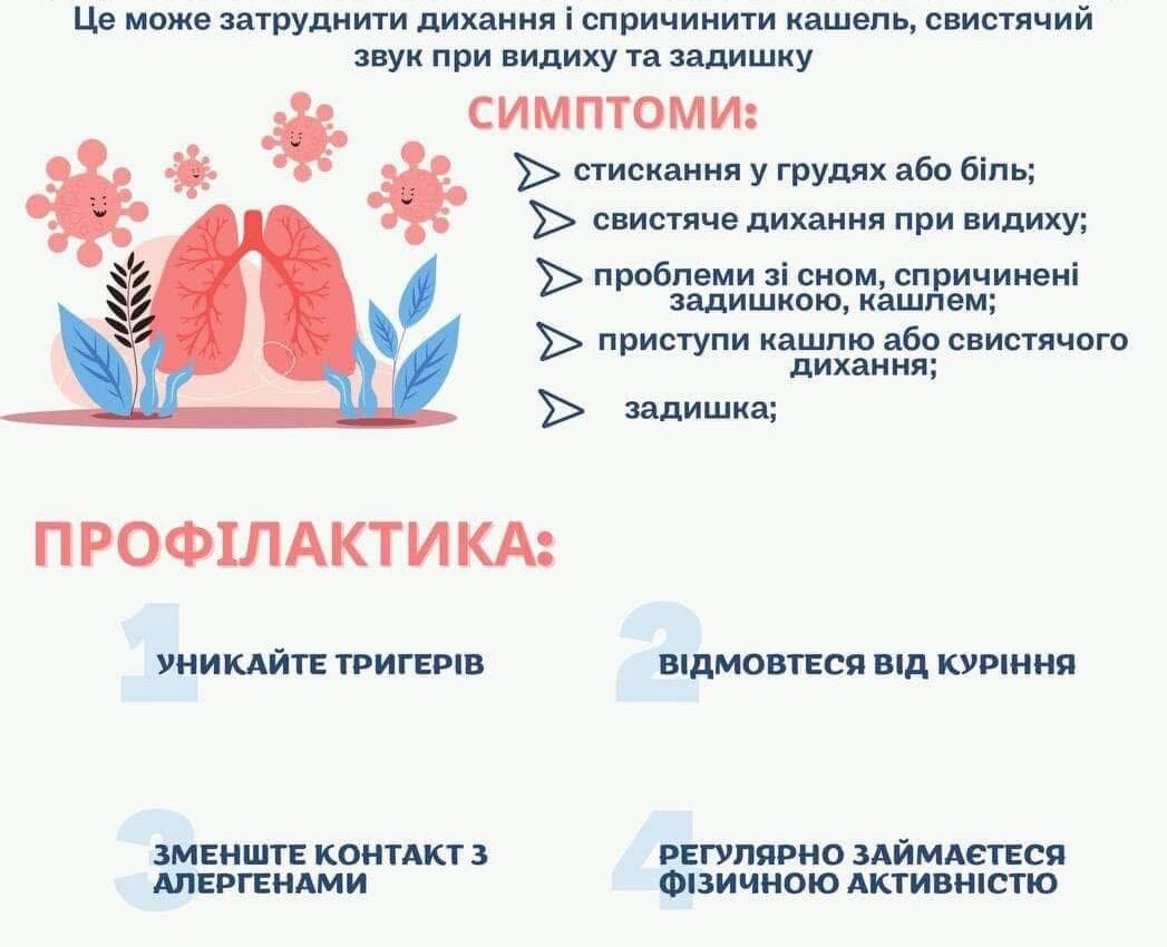 #Астма – це стан, при якому дихальні шляхи звужуються і набрякають, що може призвести до виділення додаткового слизу. Це може затруднити дихання і спричинити кашель, свистячий звук при видиху та задишку. Для деяких людей астма – це незначна неприємність, для інших – серйозна проблема, яка заважає повсякденній діяльності та здатна призвести до небезпечного нападу. Астму не можна вилікувати, проте її симптоми можна контролювати.
