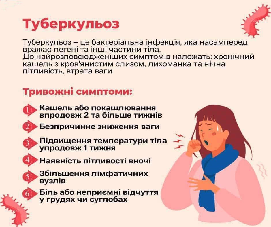 #Туберкульоз – це бактеріальна інфекція, яка насамперед вражає легені та інші частини тіла. До найрозповсюдженіших симптомів належать: хронічний кашель з кровʼянистим слизом, лихоманка та нічна пітливість, втрата ваги. Бактерії, що спричиняють туберкульоз, називаються мікобактеріями туберкульозу і передаються повітряно-крапельним шляхом.